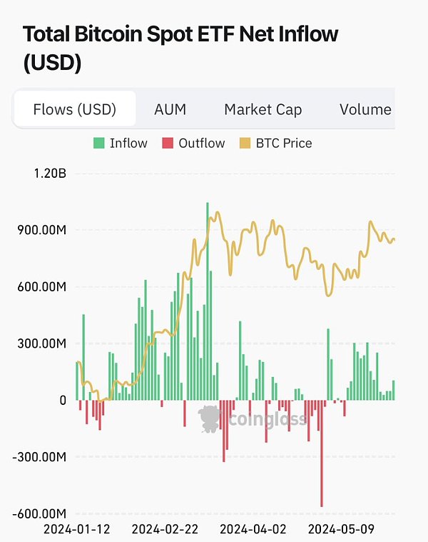 另外自5月以来资金已连续15天流入,资金流入也一直在增加。 随着降息预期升温,现货ETF的流入也在增加。