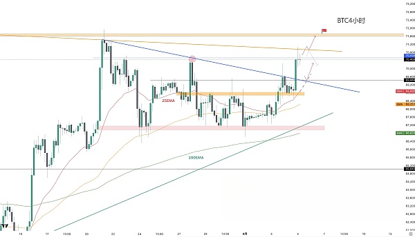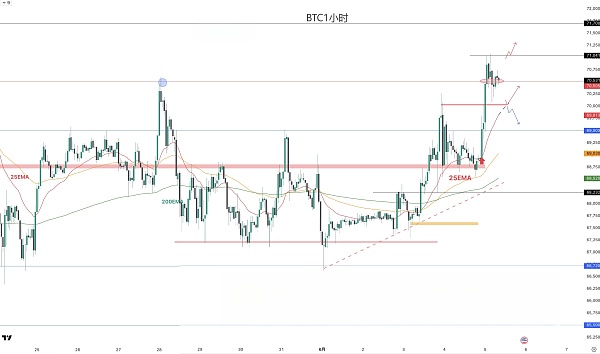 ③ 从1小时25EMA下破后顺势做空,做空价格70,200美元,止损70,700美元,目标价69,500美元、68,500美元。