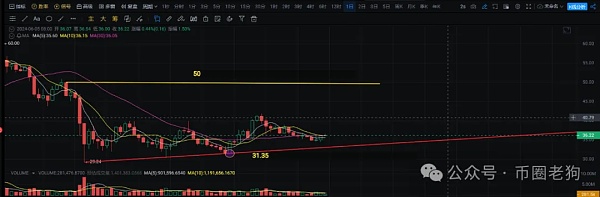 从日线级别来看,从图中可以清楚的看到AVAX在最低价格跌破30美元后迅速反弹,日线级别经过了一个月左右的调整,日线级别底部不断再抬高。并且以最低价格31.35为低点的日线级别大阳线收线涨穿了日线级别5 10MA,可以视作短期日线级别的支撑位置。上方50美元附近可以看做日线级别抛压的高点。目前日线级别企稳,短期AVAX如果价格能超过50美元上方,那么它大概率会继续向年内新高进发。如果日线级别没有突破50 美元上方。那么根据走势,它将会继续回踩日线级别均线附近进行调整。目前AVAX的价格在36.3美元附近,老狗认为是一个可以参与的价格,如果有了解的朋友可以多关注一下。