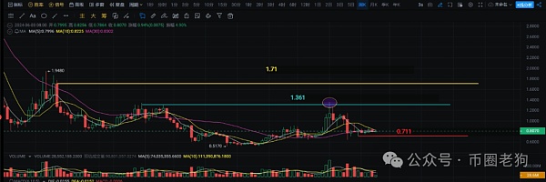从周线级别来看,EOS近一年的低点到高点涨幅也仅仅是2倍多一点,这和市场上大部分代币相比逊色的非常多。不过今年高点1.361已经涨穿了下跌前周线级别的高点。可以说1.3附近的套牢盘已经解套,目前经过多周时间的调整,EOS价格并没有跌破周线界别二次探底0.711附近。所以短期周线级别EOS的价格只要不跌破0.711那么中线来看EOS依然保持着多头趋势。短期EOS价格如果上涨,并且涨到了1.36上方,那么下一目标就是1.71附近,按照目前的价格涨幅有2倍左右,如果对EOS还抱有希望的朋友可以关注一下。