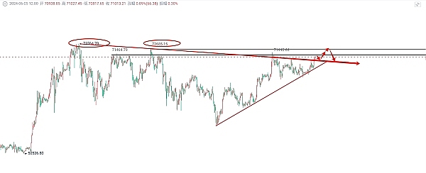 四小时级别昨日晚间大饼跟我们预期一样发力冲击上方,可以看到价格在站稳70500后多头再次发力冲击我们最终的目标点位71000附近,目前上方受阻并未有效突破,按照目前市场情绪来讲肯定是偏向于多头,但是在这一线位置布局空头的也有很多,从我们目前的盘面来讲价格去走一波冲高后,上方空间并不是很大,但是按照市场反应短期内可能并不会有太大的回落,可能会在上方高位盘整,等待行情向上或者向下测试我们压力与支撑在去选择我们的方向。