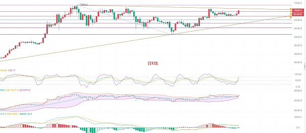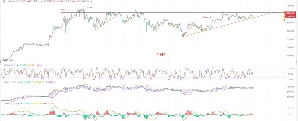 四小时K线已经背离EMA趋势指标上行出现在了高位,受阻71000整数关口,KDJ上行扩散,布林带开口以后K线破了上轨70500,按照趋势上来看 还会回到70500下方盘整,MACD放量上行,DIF和DEA上行扩散整体趋势上看K线大概率会冲击71000关口,注意做好防范,在压力位附近先布局空,回踩支撑以后布局多,