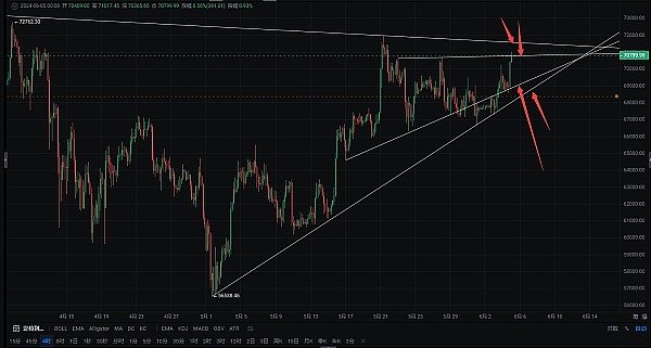 大饼4小时级别来看币价插针顶部第一趋势线位置后开始迅速收量,布林带下轨开始向下扩张,通道再一次打开,KDJ三线继续向上扩散,但是行情并未向上走,MACD中0轴上方继续存在放量现象,DIF与DEA的间距继续拉开;其实币价到这个时候,技术方面已经开始背离了,不能作为大的依据方向了,多半原因还是存在空头清算的,那么还是那句话,物极必反,多头清算也可能随时登场!操作上还是建议轻空为主,关注上方两个趋势线布局就可以了!