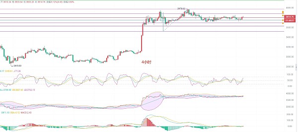 四小时K线上行受阻3824原始交换点,开始回落EMA趋势线,KDJ向上扩散,布林带还在收缩,箱体虚破一次又回到箱体内部,受阻3830压力位,下轨支撑关注3760,箱体不破多空难料,MACD缩量结束开始放量,但是K线背离却没有上行,DIF和DEA金叉趋势也成型了整体趋势确出现动能不足的情况,短线还是有一波空势,可以关注一下