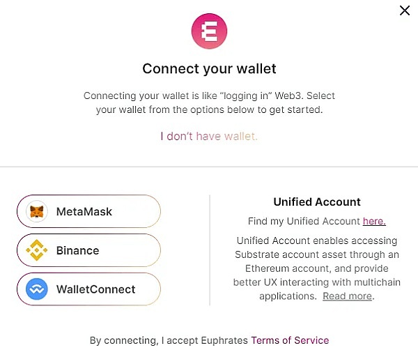 Euphrates 是建立在 Acala EVM+ ,它与大多数 EVM 钱包完全兼容,但是,为了实现最佳的多链体验,建议创建一个统一账户。统一账户简单来说就是一个连接到 Substrate 钱包的 EVM 钱包。
