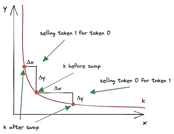 如上图,x * y = K 的曲线如上,当 x 越少,y 就越多,x 的价格就是 y/x 其实就是斜率,斜率越高,x 越贵。