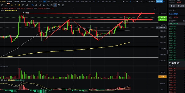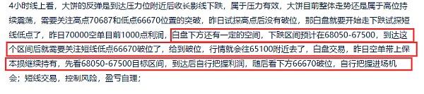 昨日我们说大饼下方还有空间,要往68050下方去,大饼下跌低点在68567位置,没有到目标区间,随后走出反弹,反弹最高点位在71275位置,空单赚1500点左右没有及时离场,最后保本损了,空单至少没有亏损;以太建议的止损位是3850附近,昨日以太拉升最高3839,以太走的比较弱,目前处于成本价附近,整体来看,大饼这波突破压力位后,就算拉高也还是有回调机会,关注短线做空信号,短期交易上,根据走势,谨慎做空,给到下跌,就做低多;