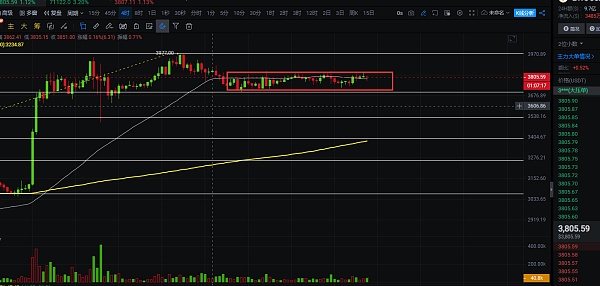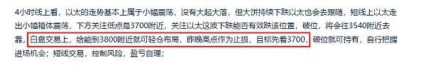 4小时线上看,不管大饼怎么涨,以太依旧是保持小幅箱体震荡,昨晚的拉升都没破短线高点3850附近,以太目前还不活跃,等大饼拉完,以太也就该活跃起来了,昨日以太3800附近有空的,严格把止损带好,白盘给到下跌小盈就离场,推荐点位3755附近,离场后可根据大饼走势来做多单的布局,3700支撑可作为止损位,目标看3915附近,到达后再看破位,以太目前走势比较慢,就不做太大突破的希望了,自行把握进场机会;短线交易,控制风险,盈亏自理;