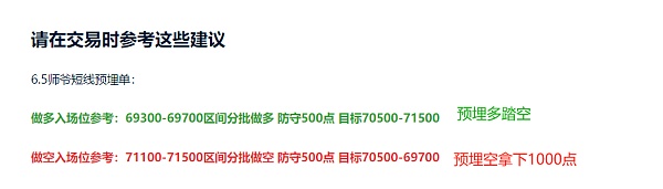 昨日师爷文章中在71100-71500区间预埋做空,行情在昨日下午15点左右最高涨至71430附近。随后反弹下跌最低跌至70420附近,文章中空单预埋目标70500完美到达,并拿下了1000点利润。