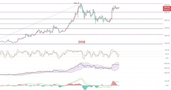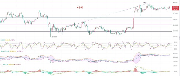 四小时K线站立EMA30趋势线3800以后拉伸最高到了3870附近,既然多头趋势已经开了,思路上可以采用回踩继续多的思路,当然高位遇到较强阻力以后也可以布局空,灵活多变,KDJ向上开口扩散,加上布林带横盘收小口的趋势已经结束布林带开口,上轨向上拉伸到了3850阻力点,下轨支撑位已经跌到了3750,思路上同样理性思考,合理布局