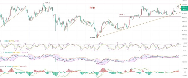 四小时线受阻72000压力位,EMA趋势指标上行扩散,EMA15快线已经到了70300,短期支撑关注70000整数关口,回踩不破可以布局多,KDJ向下收口,布林带开口以后K线围绕布林带上轨71960震荡上行,短线受阻重点关注这一阻力点,MACD放量上行以后DIF和DEA开始出现疲软,不代表多头无力,所以要做两手准备