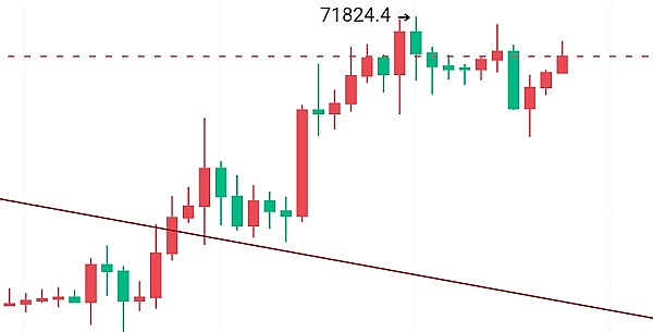 大饼昨天晚上又摸了一下日线横盘区的顶部71800一带的压力位区间,这区间阻力还挺大的,需要来一根大阳线强势突破。以太一直站上不3860这个压力位,日线级别一直在横盘区宽幅震荡,想突破又被上方压制,需要继续等待!今天晚上有一个非农数据,大家注意一下,如果不能带来波动,那么估计就要等下周三美联储公布利率决息会议!大饼晚上4小时回调了一波,目前在冲4小时的阻力区,上方压力位留意71750-72200-72900这几个价格一带!以太一直在日线横盘区宽幅震荡,上方压力位3860-3890这一带。