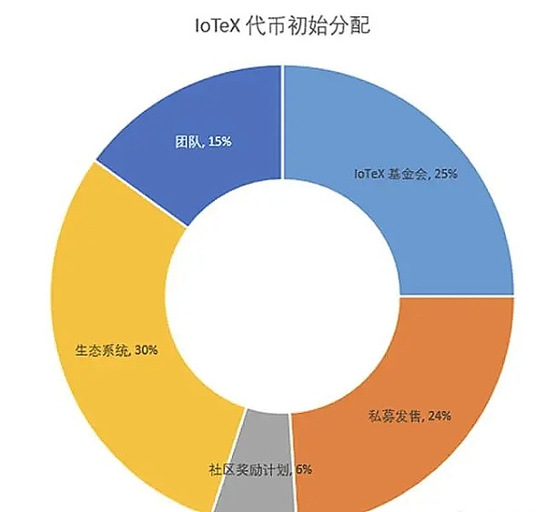 代币初始分配大致分为五大部分: IoTeX 基金会(25%)、私募发售(24%)、社区奖励计划(6%)、生态系统(30%,包括 Ecosystem Development 和 Roll-DPoS Mining)、团队(15%)。这些代币都在上线后三年内逐步解锁,于 2022 年底前完全释放。