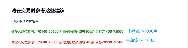 而在71600-72000区间的预埋空单,晚间行情最高涨至71715,随后凌晨的行情最低跌到了70101,文章中预埋空单目标70900-70500均精准到达并拿下1100点,总结昨日文章多空预埋一共拿下2100点!