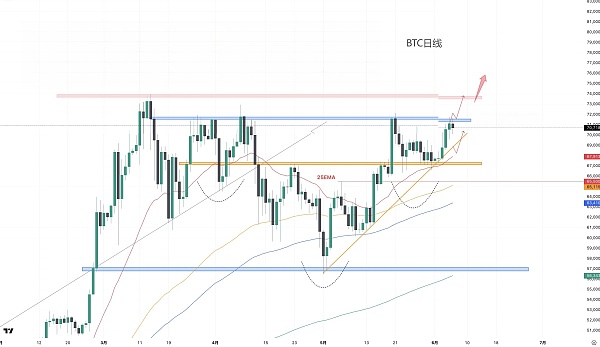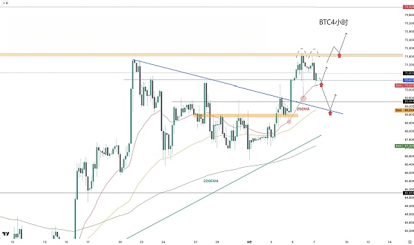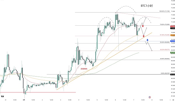 正如金瑞昨天的分析一样,比特币未能突破71,700美元附近的颈线位导致价格下跌。所以需要根据今天的非农就业数据的结果而定,可能会出现大幅突破的情况。