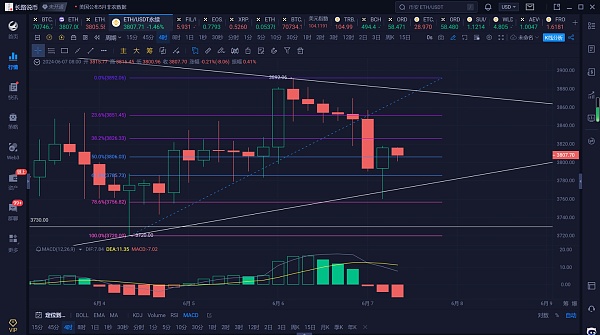 4小时线,行情反弹上方高点回踩,跌至3760附近受下方上涨趋势线的支撑反弹,并未突破上方斐波那契回撤线0.382处的压制继续回踩,随着日线布林带的随口,行情将会围绕三角形内震荡运行,而从技术指标上看,MACD依然是出于死叉的走势,其他技术指标也是向下运行,若是反弹无法突破4小师兄中轨的压制,无法配合上一个4小时线走出底部模型,那么行情将有机会继续回踩,下方可关注到斐波那契回撤线及上涨趋势线的支撑作用。今天操作上长路建议先看行情的反弹力度,不破上方的压制再空单进场。