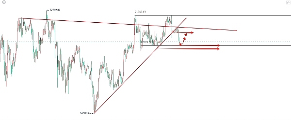 从四小时级别来看,大饼在非农的一波下跌后尝试再次回到上行趋势线内,但是在上方受阻并未站上,然后触及上方压制再次下跌,目前行情已经快要到达我们下方支撑位67200附近,目前行情来看下方短期支撑位是可以去选择做一笔多头。