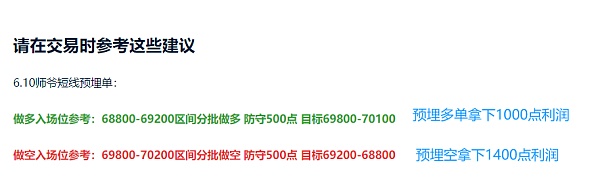 昨日师爷文章中在68800-69200区间预埋做多,行情在昨日下午5点最低跌至69200附近。随后最高反弹到了70222附近,文章中多单目标69800-70100均完美到达,预埋多拿下1000点利润!