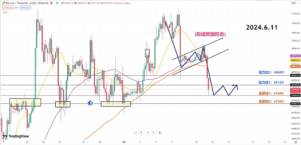 我们需要重点关注昨日师爷提到的熊旗(Bear Flag)形态是否会形成和巩固低点,如果价格跌破熊旗形态,应将67,200美元设定为关键支撑线,然后再考虑入场操作。