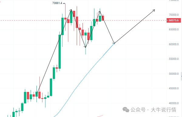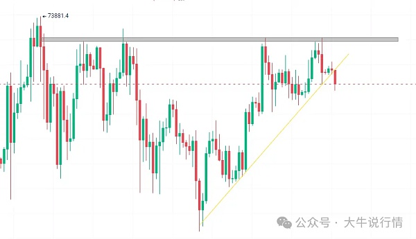 日线级别去看,72000一线多次被测试,从技术面去预估后面如果在去测试这一线破位的概率很大,但是周线的双顶概率也是存在的,所以要边走边看,就算出现突破历史高点的情况也不要上头。市场对于老美降息的预期在9月,还有三个月的时间,所以我们要谨慎的对待华尔街的镰刀。