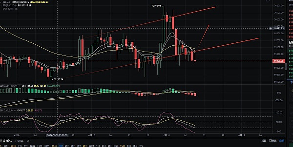 比特币早盘拉高回落来看,行情进入下跌回调路段,从图形看出三角区间即将破位处,行情最后一波回踩支撑位69500附近了,现在行情进入反弹周期了,那么我们的思路依然回踩低多思路不变即可。附图指标MACD在零轴持续徘徊处,多空量能柱交替了,KDJ指标三线进入粘合了,即将金叉形成回踩做多即可。