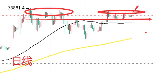 日线级别去看,72000一线多次被测试,从技术面去预估后面如果在去测试这一线破位的概率很大,但是周线的双顶概率也是存在的,所以要边走边看,就算出现突破历史高点的情况也不要上头。市场对于老美降息的预期在9月,还有三个月的时间,所以我们要谨慎的对待华尔街的镰刀。