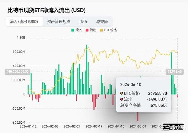 美国现货比特币ETF昨日(6月10日)净流出932枚,价值6490亿美元。