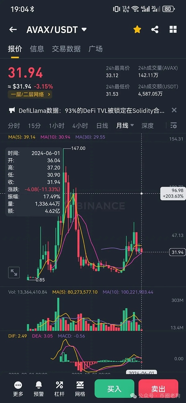现阶段,对于现货党而言依然不用太过于关注市场,只要拿好自己手中币种即可。当初PEPE创新高后随着市场回踩下跌50多个点,老狗大胆的分享自己的观点,说市场调整过后将会迎来山寨季,MEME币板块将会轮流启动,结果PEPE自买入后成几倍暴涨(按照现在价格),PEOPLE是老狗埋伏最久的山寨币种之一,结果拿着拿着也涨了很多倍。接下来老狗看好的是公链币种。其中AVAX是我下半年比较看好的币种之一。毕竟AVAX市值靠前,再加上本轮牛市公链热点主要是在SOL上面,其它公链币种还没有完全爆发,再加上AVAX的粉丝众多,也不是沉年老币,所以在接下来的6 7月份我还是很看好它的。