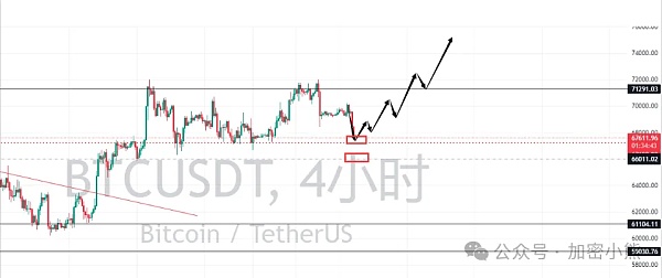 比特币自上次加速下跌后,目前在较小级别上已接近关键支撑位置,大约是4小时级别的均线支撑。这个位置的多空博弈尤为重要,下方需关注67100的支撑位,若跌破,则可能测试66000附近的支撑。