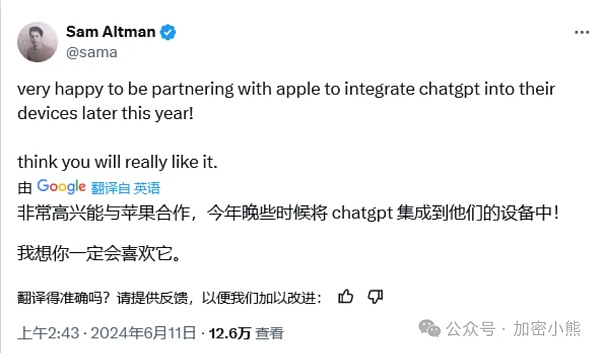 在今天的推特上,山姆·阿尔特曼(Sam Altman)发布了一条推文:“非常高兴能够与苹果合作,ChatGPT 将于今年晚些时候整合到苹果设备中!我相信你一定会喜欢它。”