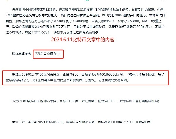 关注上方70400到70500附近的盘口,破位以后可顺势追多,目标参考71000到71500,止损400点