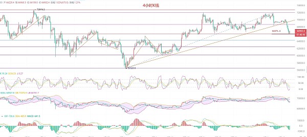 四小时K线连续的收阴以后受阻66000支撑也就是黄金分割线0.618支撑开始反弹,说明支撑有效,KDJ下行受阻以后开始向上收口,不快递开口空势出现阶梯式下跌,K线跌破下轨线66800以后回到了布林通道内,中轨阻力点69000,MACD缩量增筹,DIF和DEA低位向下扩散趋势还没有缓解,整体思路上回踩上方压力位空为主,低多为辅