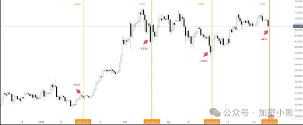 随着全球其他国家继续降息,美国将很难忽视这一点,而比特币似乎正在逐步消化美联储的降息影响。匿名加密货币分析师Gumshoe在X平台发文指出,比特币在今年FOMC会议之前曾多次回调,分别达到10%、11%、10%和4%,但之后不久都很快扭转了走势。