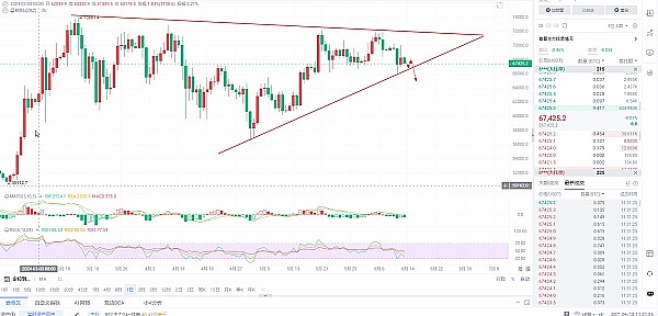 比特币和山寨币投资者的市场情绪呈下降趋势,由于比特币无法突破 72,000 美元的阻力位,投资者热情开始降温,比特币近期回调后,投资情绪明显减弱,最近的数据显示,比特币活跃地址数量明显减少,反映出交易活动在今年早些时候达到峰值后有所下降,这种下滑与比特币的价格调整及其随后的横向波动有关,日线级别K线价格运行在布林带中下轨,昨天由于CPI数据利好比特币进行强行拉升清理了一波空头之后,凌晨鲍威尔利率决议会中讲到维持利率不变之后导致价格开始逐步进行回落,目前价格处于一个震荡下跌走势,说明空头比较强势,多军想要反转突破历史新高那么必须每日的收盘价格在上一轮牛市的高点,四小时级别附图指标MACD多头正在缩量,日内交易如果有反弹到68300可以空单进场,止损带在68780,目标67200-66600,长线布局看64500,如果空单没有做进去,那么在下方64500挂一个多单,止损带600个点