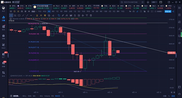 以太坊上个交易日凌晨回踩下方3430附近支撑反弹,白盘处于震荡上行中,晚盘受到美CPI利多的影响爆拉3655附近后震荡,凌晨在确定不加息后又开始回踩,最低跌至3515附近反弹,现行情位于3545附近震荡。
