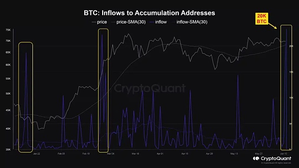 根据 CryptoQuant 的最新数据,在本周早些时候的市场调整中,超过 20,000 个比特币流入了鲸鱼钱包。这表明,大型投资者一直在利用市场的每一次下跌来增加持仓量。