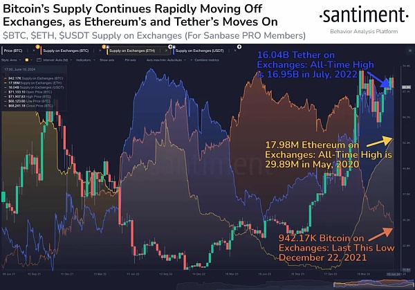 根据链上数据提供商 Santiment 的数据,自 2021 年 12 月以来,交易所的比特币总供应量已降至 100 万以下,至 942,000 比特币,这是近三年来首次出现这种情况。
