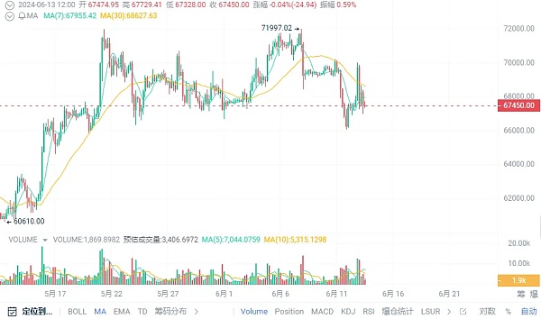 在CPI数据低于预期且通胀降温迹象显现后,比特币(BTC)价格曾试图突破 70,000 美元。然而,截至目前,多头未能维持这一涨势,BTC 回落至 67,400 美元的水平。