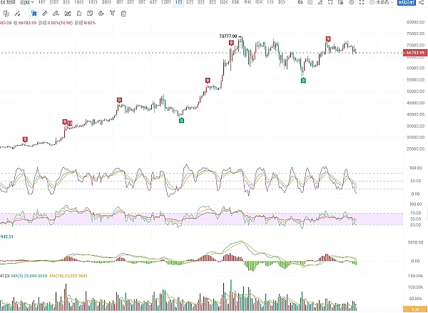 比特币日线级别均线的走势内,昨日的反抽其实只是对于跌破MA30后的一个确认,今日没有站上MA30这为接下来下探MA120做准备,也就是说今天就存在下探的走势;Boll的行情内,现在的走势维持着跌破和横盘的零界点,前天的横盘忽略,昨日可以看到第二连阴,那么今日要再次阴线就可以看作趋势下跌了。小时级别来看,比特币自CPI数据公布之后,出现一波暴涨,凌晨美联储利率公布之后又出现一波下跌,画了一个门,短时的暴涨暴跌导致K线形态走的很难看,日内会以修复K线震荡走势为主,压力位70000,支撑位66000。