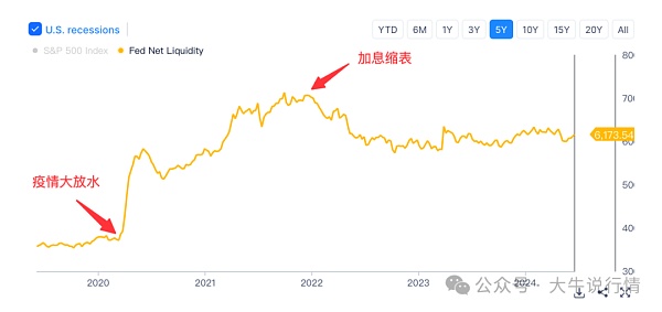 从美元流动性的图表走势看,2020年疫情大放水后,美元流动性极速提升,随后美股和加密市场走牛;2022年初,美联储加息缩表,流动性降低,美股和加密市场走熊;2023年美联储动用金融工具救助硅谷银行破产后恐慌蔓延的银行业,美元流动性企稳,美股和加密市场再次走牛。