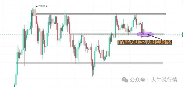 小时级别来看,比特币自CPI数据公布之后,出现一波暴涨,凌晨美联储利率公布之后又出现一波下跌,画了一个门,短时的暴涨暴跌导致K线形态走的很难看,日内会以修复K线震荡走势为主,压力位70000,支撑位66000。