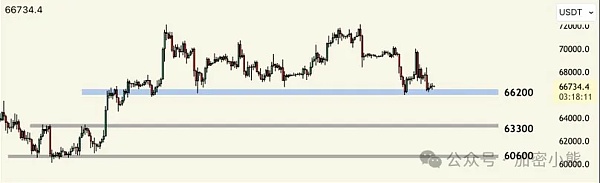 目前应保持观望,不要大仓位进入。市场正处于多空分水岭,若反弹但未突破阻力位,建议在高位做空即可。BTC支撑位在66200,ETH支撑位在3435。