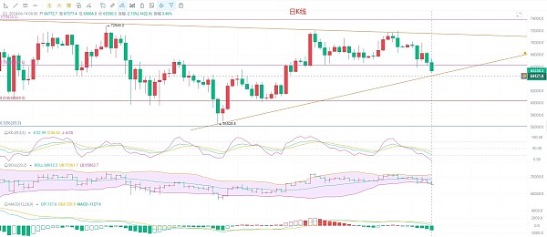 来看日K线截止发稿前凌晨三点多,日K线现价65350附近,EMA趋势指标开始低头,收缩,日K线跌破EMA60向下回踩EMA90支撑64800,KDJ依旧是向下扩散,布林带如期开口向下,日K线跌破下轨支撑65850,现在支撑变压力,MACD缩量下行以后,DIF和DEA高位向下已经靠近了0轴线,说明快要到平衡点了,但是平衡点是多空的转折点,并不是底部,所以不要混为一谈,