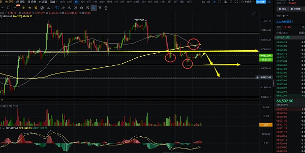 4小时线上看,大饼的下跌是刚好到达周五说的第一目标后没有去延续下跌,随后走出小幅反弹,前面跟大家说过,67300位置是前面作为关键支撑点位,现在跌破后就作为了关键压力位置,大饼的走势低点也是在不断的刷新,均线也是形成死叉,重重迹象表明大饼还需要下跌,白盘大饼很大机会需要去试探一下67300位置后再开始走下跌,白盘的交易思路依旧是做高空,点位推荐67200附近,自行把握进场,目标先看65100,破位后看64300附近,自行把握;短线交易,控制风险,盈亏自理;