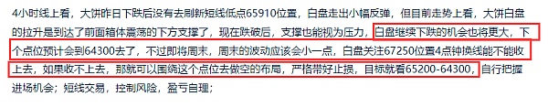 周五跟大家做了行情预测,预计周末会有下跌,周末的波动也是小一点,不过大饼的下跌也是如预期走出,最低点位在65066位置,是到达了目标区间,下跌前的反弹也是给到了我们67250布局机会,这波下跌利润在2000点左右;以太也是3525给到进场机会,下跌低点在3362,基本也是到达目标点位,利润在150点左右;恭喜跟上战神短线机会的朋友,下跌后行情并未延续,白盘将走出小幅反弹后再开始下跌;