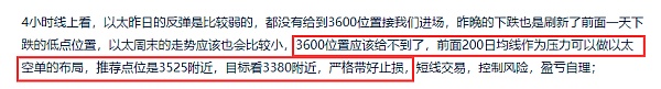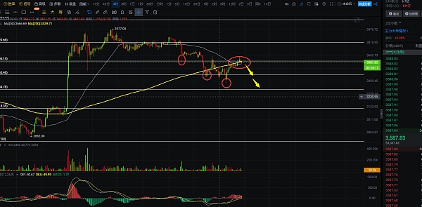4小时线上看,以太的这波反弹力度相对于大饼来说就稍微强势一点,都冲破了200日均线,但12点换线后又回到均线下方,加上均线也是形成死叉,说明上方3605压力位还是有效压力,以太的低点也是在不断的刷新,大饼没有反弹突破的迹象,以太独立反弹的机会比较小,白盘以太也将继续走下跌,推荐点位3605附近,预计下跌点位在3440-3380,如周末下跌低点3362跌破,那就要往3240去了,自行把握进场机会;短线交易,控制风险,盈亏自理;