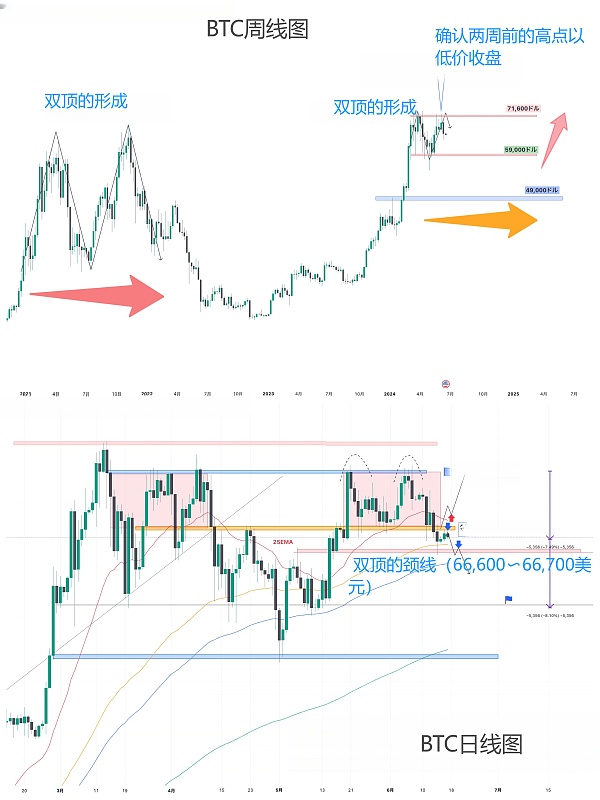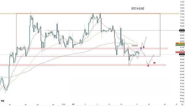 和之前金瑞分析的一样,比特币再次测试双顶的颈线位。如果无法实质性突破66,600〜66,700美元,可能会大幅下跌,所以金瑞认为在日线25EMA突破后才适合在波段水平上做多。