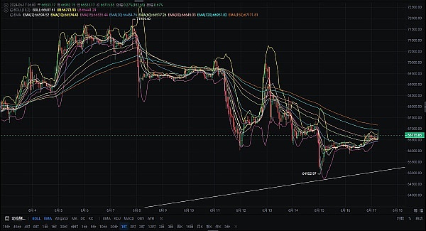 比特币1小时级别来看币价当前向上冲破EMA80向上插针EMA120后再次展开回落,看来上方67000关口存在较强压制,KDJ三线有意底部拐头,MACD中0轴有意继续存在放量,DIF与DEA也正在高位形成死叉后却又正存在扳回的局面,但布林带通道向上开口,日内可能存在小涨幅,重点关注上方EMA150的突破情况!