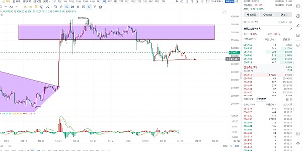 以太坊自从跌到老王预计的点位之后受到了下方3350关键支撑位进行止跌反转拉升最高至3653附近,目前上方受到3550的阻力位导致价格在3550附近徘徊,附图指标MACD移动平均线运行在0轴下方,多头量能并不是很强,从日线级别裸K去看以太坊短期会有回撤的动作,操作建议3550空单进场,止损带35个点,目标3450,做好分批止盈,由于嗓子不舒服今天就不给大家录制短视频了