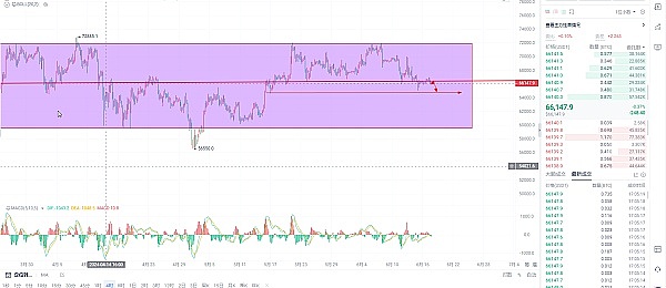 经过一个平静的周末后,比特币在上个工作周的开局就瞄准了备受期待的 70000 美元大关。然而,看跌压力迅速出现,导致价格下跌 4000 美元。这一走势发生在美国消费者价格指数 (CPI) 发布和联邦公开市场委员会 (FOMC) 会议的预期之中。公布后,通胀数据超出预期,一度推动比特币回升至7万美元,但美联储维持利率立场,与欧洲央行降息不同,导致价格再次下跌,比特币随后暴跌至6.5万美元的月低点。到周末,比特币恢复了一些稳定,并升至略高于 66000 美元。尽管今天早些时候试图达到 67000 美元,但比特币略有回落,目前徘徊在 66000美元左右。加密市场正面临一段艰难时期,比特币无法维持超过 67000 美元大关的势头,领先的山寨币也经历了下跌。种种迹象表明整个大盘的走势就是一个偏向空头趋势,现货币友耐心等待,建议空单入场,止损带685个点,目标65000-63500做好分批止盈,中长线布局需要耐心持有,可以在下方挂一个多单63550去挂多单,止损带在63000后方,目标2000个点,整体走势比较偏向弱势,激进者可以在66300空单进场,止损带320个点,目标一样